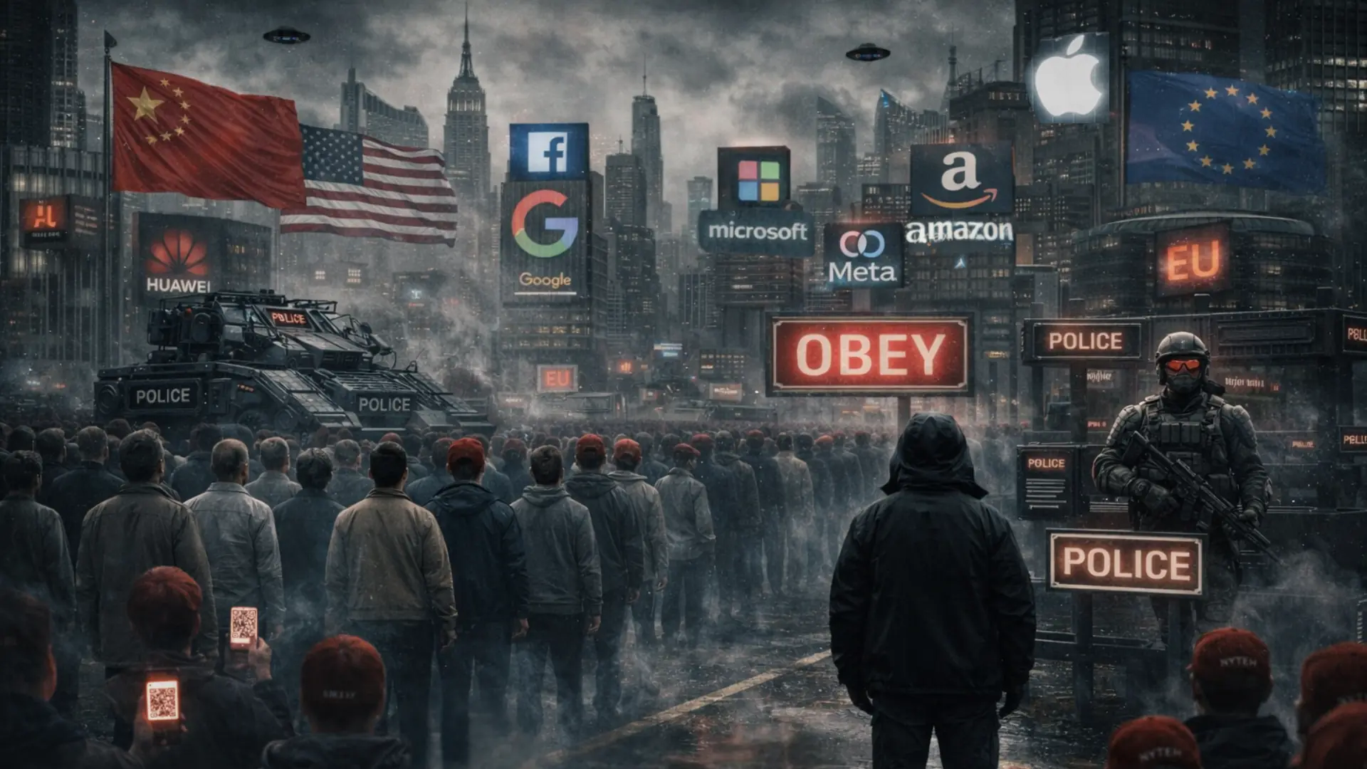 SEO alt text (already in the image tag): “American authoritarianism — An American city under biometric surveillance: checkpoints, facial scanners, and corporate towers…”